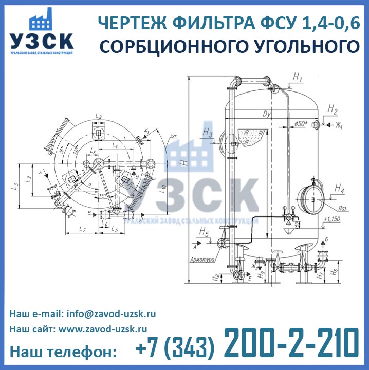 Если вы ищете фильтры ФСУ-1,4-0,6 в Новочебоксарске от изготовителя, то Вы на правильном пути! Уральский завод стальных конструкций – непосредственный производитель сорбционных фильтров ФСУ, предлагающий самые выгодные цены на ФСУ-1.4-0.6 в Новочебоксарске. По окончании процесса производства угольные фильтры проходят гидравлические испытания пробным давлением 0,9 МПа на аттестованном гидростенде, находящимся в собственности завода УЗСК. Мы гарантируем высокое качество выпускаемой продукции, и в этом уже убедились ведущие предприятия промышленного сектора России и стран ЕАЭС (см. раздел «Наши клиенты»).
